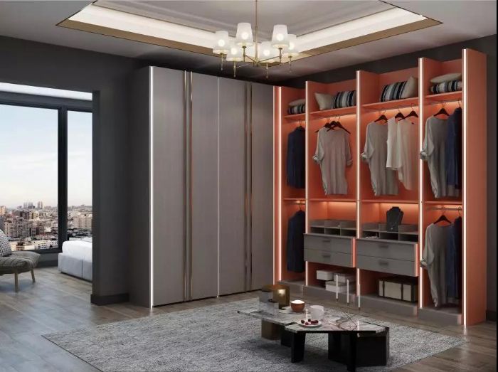 開放式的衣帽間讓視野毫無(wú)遮擋,然后采用局部點(diǎn)綴的方式應(yīng)用愛馬仕橙,以此來(lái)提升空間格調(diào)。伯爵世家就是愛馬仕橙本色出演的典范。