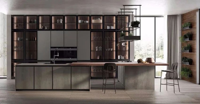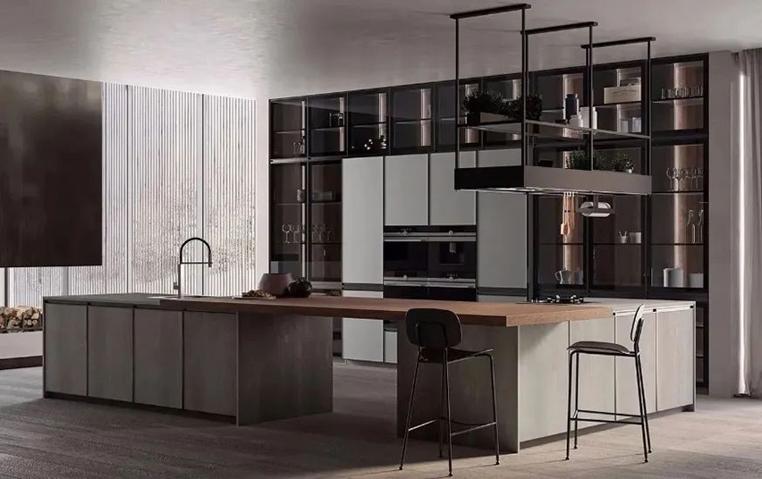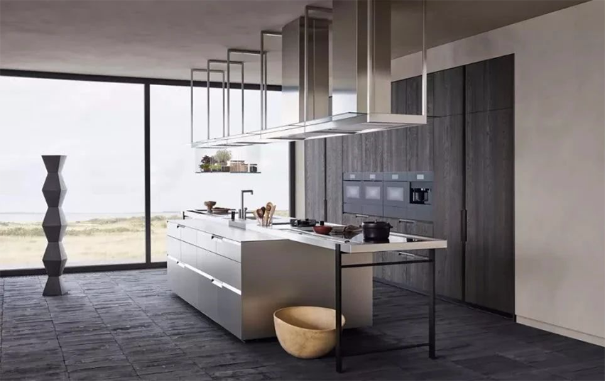 別墅廚房一般采用島式或者半島式布置,在島的上方可以設(shè)計鋁制吊架、實木系列吊架、