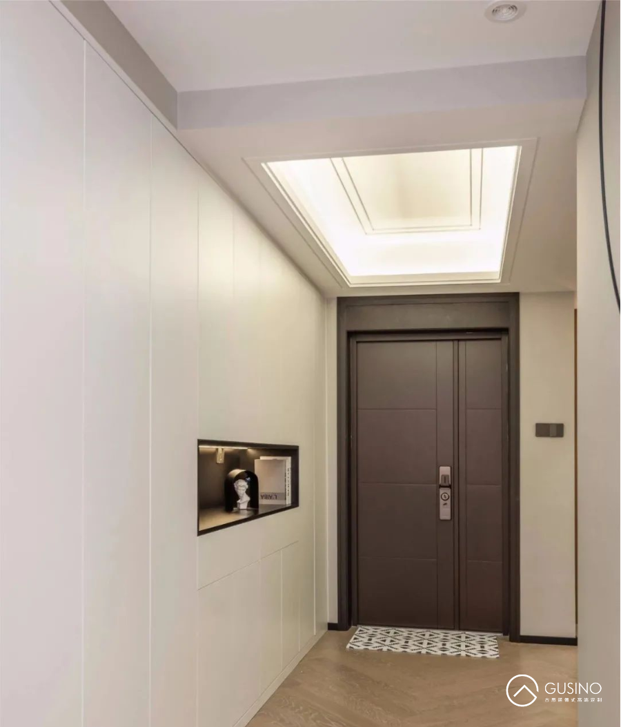 入室第一眼的印象,簡(jiǎn)約自然。門廳以白作為底色,一進(jìn)門就看到一抹明亮,內(nèi)心自然而然也會(huì)被光明照亮,在勞累一天之后,獲得一絲溫暖的慰藉。