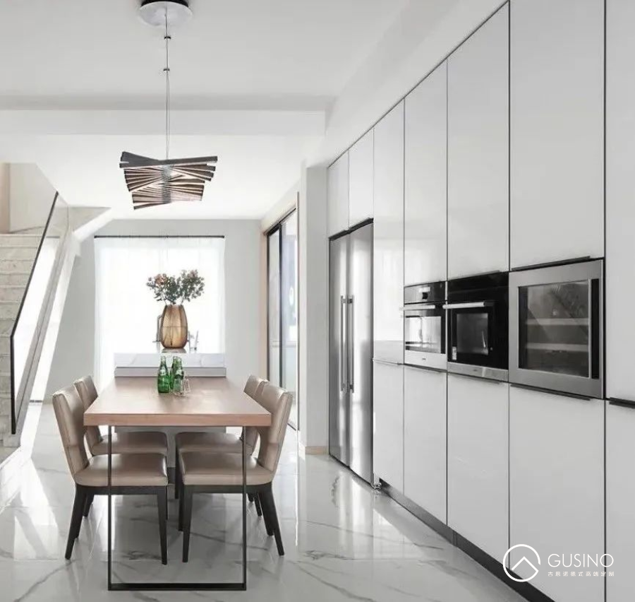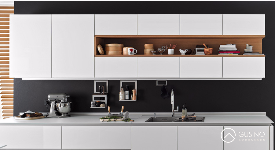 中西方的廚房定制,白色幾乎都是格調(diào)廚房的首選。首先白色作為廚房選色干凈,油污一目了然,其次,高亮度的臺(tái)面和櫥柜使得餐廚器具更加精致高檔。