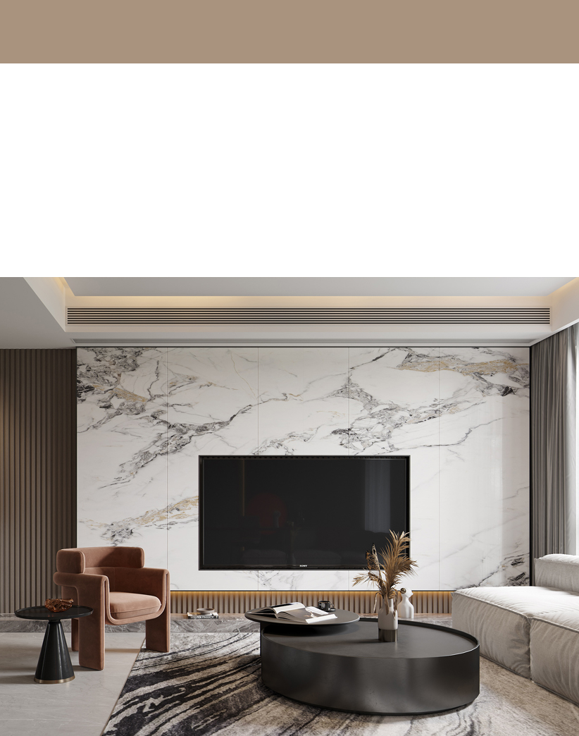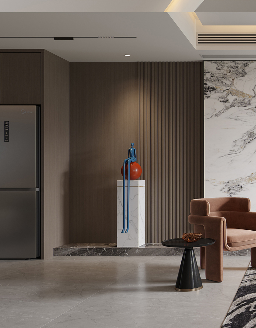 電視背景的大理石紋,與對(duì)應(yīng)的沙發(fā)淺灰背景形成反差,低飽和訴說(shuō)婉約之美,于時(shí)光間,留予侘寂極簡(jiǎn)表達(dá)溫柔美學(xué)。